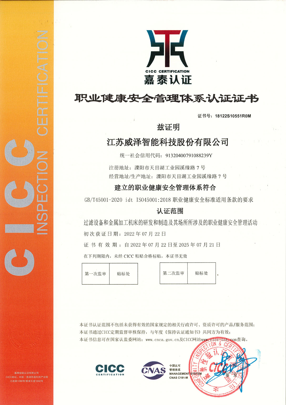 职业健康安全管理体系认证证书