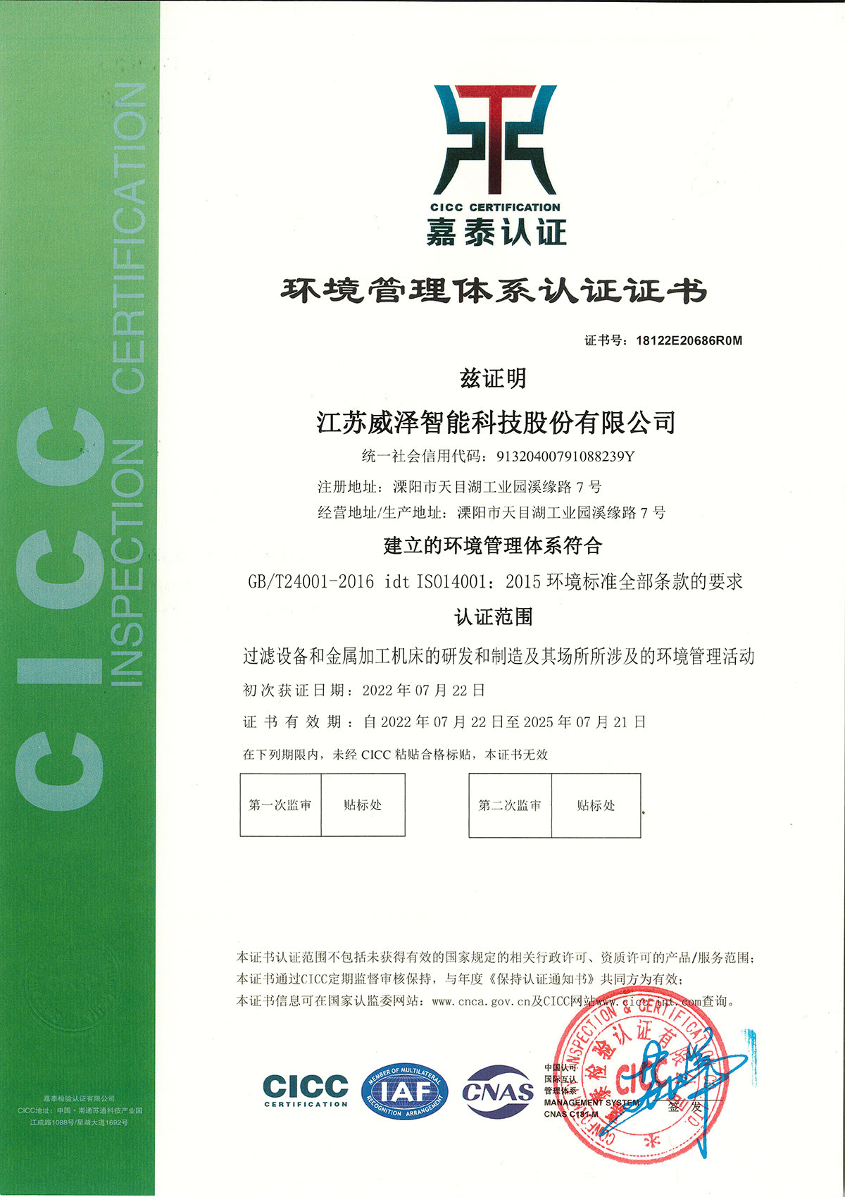 环境管理体系认证证书